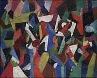 Bruce exhibited regularly in the Salon d'Automne, and met many of the leading artists of the early twentieth century avant garde. During a period of close friendship with Sonia and Robert Delaunay in 1912–14 his paintings were influenced by Orphism, but Bruce never formed an attachment to any school. Although he never exhibited with the Synchromists or gave his paintings Synchromist titles,[2] in 1916 he developed a form of abstract painting that strongly resembled Morgan Russell's synchromist compositions of muscular, flat color areas (for example, see Bruce's Composition I).[3]