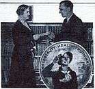 He designed a contest-winning poster titled "Usefulness • Beauty • Health • Truth • Knowledge," for the Girl Scouts in 1931.[23][24][25] This contest was conducted by the Art Alliance of America,[26] an organization that brought together craft workers and manufacturers. The six-judge panel consisted of W. T. Benda (who replaced Charles Dana Gibson),[27] Ray Greenleaf, Rockwell Kent, John La Gatta, Neysa McMein and Edward A. Wilson.[28] Martin's model for the poster was the teenage daughter of family friends from Darien, Conn. (who formerly resided in Yonkers, N.Y.).[28][29][30] It earned him a $300 check from the Girl Scouts' national director, Josephine Schain (pictured). This exchange took place at their old national headquarters, on Lexington Avenue in New York City.[31] National president Mrs. Frederick (Birdsall Otis) Edey was one of three consultants, along with executives Mrs. Arthur O. (Anne Hyde) Choate and Mrs. Nicholas F. (Genevieve Garvan) Brady.[27] This poster (partially pictured in insert) later appeared with a salute alteration, on the cover of Girl Scout Equipment catalogs for Fall 1932 and Spring 1933. It captured the spirit of their character-building movement, and was in popular usage until 1937.[24][27] Martin on picking his subject: "Barbara seems [to be] the personification of all that Girl Scouting means. She is the very spirit of radiant, happy and wholesome young girlhood, and my mind naturally turned to her immediately when I learned of the competition ..."[32]