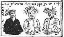 Patollu was first mentioned in 1418 by Bishop of Warmia in a letter to the Pope.[1] Chronicler Simon Grunau (1529) provided more vivid but dubious details about Patollo. According to Grunau, Patollo was one of the three gods portrayed on the flag and coat of arms of King Widewuto and worshiped in the temple of Rickoyoto. He was portrayed as an old man with a white beard and a white headdress similar to a turban. He was a scary and ruthless god of the dead who would haunt and taunt the living if they disobeyed their pagan priests or buried the dead without proper sacrifices to the gods. Many other medieval writers, including Alexander Guagnini and Lucas David, followed Grunau in descriptions of Patollo.[1]