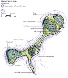 Peddocks Island is one of the largest islands in Boston Harbor.[1] Since 1996 it has formed part of the Boston Harbor Islands National Recreation Area. Managed by the Department of Conservation and Recreation, the island is home to the now-defunct Fort Andrews, active in harbor defense from 1904 to the end of World War II, on its eastern end, and a group of privately owned cottages on its western end.[2] Campsites are also on the eastern end. Ferry service between Peddocks Island and Georges Island (where Fort Warren stands) is provided on a seasonal basis.