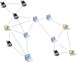 Overlay network diagram for an unstructured P2P network, illustrating the ad hoc nature of the connections between nodes