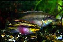 Like other Pelvicachromis species, P. pulcher is sexually dimorphic. Males have pointed pelvic, dorsal, and anal fins, while the female's pelvic, dorsal, and anal fins are more rounded in appearance. In addition, males are larger, lack the gold sheen to the dorsal fin and have a more elongated, spade-shaped caudal fin.[3][4] Despite the suggestion in the aquarium literature that the species forms monogamous pairs,[5] the formation of polygynous harems is not uncommon in the natural habitat.[8] The species are secretive cave spawners (speleophils) although detailed information on their reproductive biology in the wild is limited. In the wild, the species is known to breed in holes excavated beneath aquatic and semi-aquatic plants. In captivity, artificial caves are readily accepted as breeding sites, however, these too are excavated prior to egg-laying.[3] The eggs are adhesive and are frequently laid in rows of ca. 10 on the upper surface of the cave and produce a clutch that ranges in size from 40 to 100.[3][8] Both the male and female provide active brood care, typically lasting 21–28 days,[3] which includes guarding, herding, and feeding. It is noteworthy, however, that the female is predominantly responsible for fry care, while the male is primarily involved in territorial defence.[8] As in all Pelvicachromis species, the gender ratio of female to male fry increases with pH.[7][12] This ratio is also known to vary at different locales in the wild.[8] Breeding pairs of P. pulcher have been known to adopt similarly aged fry from conspecifics in aquarium trials, and it has been suggested this may be an adaption to reduce predation on their own fry.[13] Male colour polymorphism may be indicative of behavioural differences. For example, red males obtained from a single site were found to be more aggressive and more polygamous than yellow males obtained from the same site.[8] In addition, the species has been demonstrated to engage in cooperative territorial defence where multiple males defend a single territory.[8]