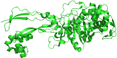 PBPs have been shown to catalyze a number of reactions involved in the process of synthesizing cross-linked peptidoglycan from lipid intermediates and mediating the removal of D-alanine from the precursor of peptidoglycan. Purified enzymes have been shown to catalyze the following reactions: D-alanine carboxypeptidase, peptidoglycan transpeptidase, and peptidoglycan endopeptidase. In all bacteria that have been studied, enzymes have been shown to catalyze more than one of the above reactions.[2] The enzyme has a penicillin-insensitive transglycosylase N-terminal domain (involved in formation of linear glycan strands) and a penicillin-sensitive transpeptidase C-terminal domain (involved in cross-linking of the peptide subunits) and the serine at the active site is conserved in all members of the PBP family.[3]