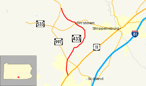 Pennsylvania Route 433 (PA 433) is a 9.1-mile-long (14.6 km) state highway located in Franklin County, Pennsylvania. The southern terminus is at U.S. Route 11 (US 11) near Red Bridge. The northern terminus is at PA 997 in Lurgan Township. PA 433 is a two-lane undivided road that passes through farmland in northern Franklin County. The route passes to the east of the Letterkenny Army Depot before it crosses PA 997. The route heads northeast and north before curving northwest and crossing PA 533 in Orrstown. PA 433 continues northwest to its end at PA 997.