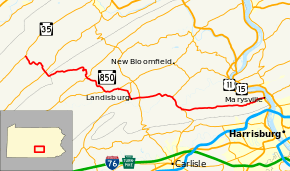 Pennsylvania Route 850 (PA 850) is a 44-mile-long (71 km) state highway located in Juniata and Perry Counties in Pennsylvania. The western terminus is at PA 35 in Tuscarora Township. The eastern terminus is at US 11/US 15 in Marysville. PA 850 is a two-lane undivided road that runs through rural areas in the Ridge-and-Valley Appalachians. The route heads southeast from PA 35 and crosses PA 75 in Honey Grove before it traverses Tuscarora Mountain and leaves Juniata County for Perry County. PA 850 continues southeast and crosses PA 17 in Kistler before running east concurrent with PA 274 between Fort Robinson and Loysville. The route turns back to the southeast and heads south concurrent with PA 233 into Landisburg. PA 850 heads east, crossing PA 74 in Alinda before following PA 34 southeast between Dromgold and Shermans Dale. From here, the route continues east to its terminus in Marysville. PA 850 was designated in 1928 to run from PA 274 in Fort Robinson northwest to Kistler, with the road between Landisburg and Dromgold designated as part of PA 233. In the 1930s, the route was extended to its current length between PA 35 in Tuscarora Township and PA 14 (now US 11/US 15) in Marysville, replacing the portion of PA 233 between Landisburg and Dromgold.