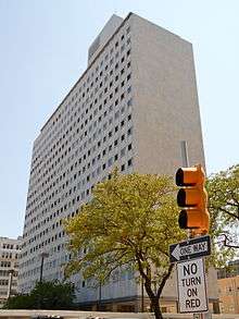 Pennsylvania State Office Building is a historic office building located in the Hahnemann neighborhood of Philadelphia, Pennsylvania. It was built in 1957-1958, and is an 18-story, steel frame and reinforced concrete building. It is clad in white marble exterior panels and measures 63 feet by 259 feet. Its style is reflective of the Modern movement. The building is surrounded by a group of formal concrete plazas. At one end is a black granite fountain with a double concave shape.[2]