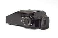 A variant of this prism is the roof pentaprism which is commonly used in the viewfinder of single-lens reflex cameras.[1] The camera lens renders an image that is both vertically and laterally reversed, and the reflex mirror re-inverts it leaving an image laterally reversed. In this case, the image needs to be reflected left-to-right as the prism transmits the image formed on the camera's focusing screen. This lateral inversion is done by replacing one of the reflective faces of a normal pentaprism with a "roof" section, with two additional surfaces angled towards each other and meeting at 90°, which laterally reverses the image back to normal. Reflex cameras with waist-level finders (viewed from above), including many medium format cameras, display a laterally reversed image directly from the focusing screen which is viewed from above.