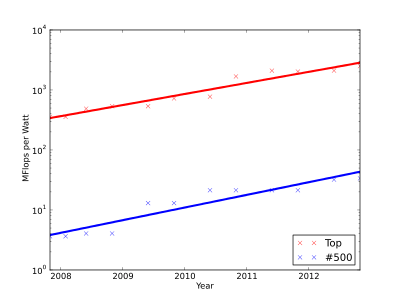 The Green500 list ranks computers from the TOP500 list of supercomputers in terms of energy efficiency, typically measured as LINPACK FLOPS per watt.[16][17]