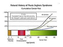 The risks associated with this syndrome include a strong tendency of developing cancer in a number of parts of the body.[9] While the hamartomatous polyps themselves only have a small malignant potential (<3% - OHCM), patients with the syndrome have an increased risk of developing carcinomas of the pancreas,[10] liver, lungs, breast, ovaries, uterus, testicles and other organs.