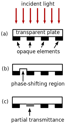 Phase-shift masks are photomasks that take advantage of the interference generated by phase differences to improve image resolution in photolithography. There exist alternating[1] and attenuated phase shift masks.[2]