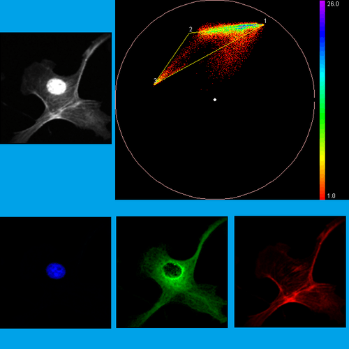 This another interesting feature, there is a one-to-one correlation between the pixels in the image and their phasors on the phasor plot depending on their spectrum or decay curve. The phasors for pixels with similar temporal-spectral properties fall on a similar regions and this provide a mean for sorting the image pixels according to their temporal-spectral properties. By making region of interest on phasor plot a reciprocal transformation can be performed and the phasors can be projected back to the image which allows a basic segmentation.