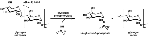 An example of this is glycogen breakdown by glycogen phosphorylase, which catalyzes attack by inorganic phosphate on the terminal glycosyl residue at the nonreducing end of a glycogen molecule. If the glycogen chain has n glucose units, the products of a single phosphorolytic event are one molecule of glucose 1-phosphate and a glycogen chain of n-1 remaining glucose units.