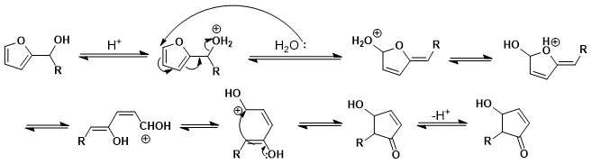 It was proposed by Piancatelli that the reaction is a thermal electrocyclic reaction of a conrotatory 4π electron system while studying specifics of the mechanism conditions when synthesizing the 4-hydroxycyclopentenone derivatives. This mechanism was suggested when studying 1H NMR spectra as it became apparent that the final products exclusively delivered the trans isomer.[1]