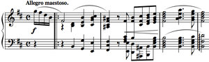 Its turbulent and dramatic introduction–a rising harmonic progression left hanging on a high dominant seventh–aside, the finale, in B minor, is pervaded by a "galloping" rhythm; emphasis in the melodic line on the first and third beats of each half-measure outlines the fifth through eighth degrees of a harmonic minor scale, in this case the F♯ and B, lending prominence to the augmented second between the sixth and raised seventh scale degrees, the G and A♯. The overall melody, chromatic yet rooted in the minor tonic, contributes a dark mood to these primary sections. A more triumphant second theme in B major, repeated twice in the movement's A-B-A-B-A form, appears quite suddenly at the conclusion of the first (likewise when repeated); eventually rising during fleet-fingered runs over a left-hand melody, it tumbles back to a dramatic restatement of the main theme in both of its appearances. The piece concludes in a jubilant B major coda.