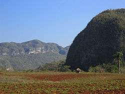 The Pinar del Río province is Cuba's westernmost province and contains one of Cuba's three main mountain ranges, the Cordillera de Guaniguanico, divided into the easterly Sierra del Rosario and the westerly Sierra de los Órganos. These form a landscape characterised by steep sided limestone hills (called mogotes) and flat, fertile valleys. One such topographic feature, the Viñales Valley, is a UNESCO World Heritage Site.