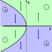 Note that subcritical and supercritical describe the stability of the outer tines of the pitchfork (dashed or solid, respectively) and are not dependent on which direction the pitchfork faces. For example, the negative of the first ODE above, , faces the same direction as the first picture but reverses the stability.