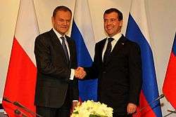 Modern Polish–Russian relations begin with the fall of communism – 1989 in Poland (Solidarity and the Polish Round Table Agreement) and 1991 in Russia (dissolution of the Soviet Union). With a new democratic government after the 1989 elections, Poland regained full sovereignty,[1] and what was the USSR became 15 newly independent states, including the Russian Federation. Relations between modern Poland and Russia suffer from constant ups and downs.[3] Among the constantly revisited issues is the fact that Poland has moved away from the Russian sphere of influence (joining NATO and the European Union)[1][2] and pursuing an independent politic, including establishing a significant relations with post-Soviet states;[2] for example, Polish support for the pro-democratic Orange Revolution in 2004 in Ukraine has resulted in a temporary crisis in the Polish–Russian relations.[2] Occasionally, relations will worsen due to remembrance of uneasy historical events and anniversaries, such as when Polish politicians bring up the issue of Russia apologizing for the '39 invasion, the Katyn massacre. (Many Polish citizens and politicians see as genocide, but Russian officials refer to it as a war crime rather than a genocide[2][3]) or for the ensuing decades of Soviet occupation;[2] in turn Russians criticize Poles' perceived lack of thankfulness for liberation from Nazi occupation (despite later being taken into Soviet occupation).[3] During the 1990s, assistance granted by Polish government and civilian agencies to members of the Chechen separatist movement had been met with criticism by Russian authorities.[7] In 2009, there had been controversy over the Russian government and state media publishing claims that Nazi Germany, the Empire of Japan and the Second Polish Republic had allied or intended to ally against the Soviet Union before the Second World War.[8] These claims were denounced by Polish politicians and diplomats as an attempt at historical revision.[9][10][11] Other issues important in the recent Polish–Russian relations include the establishment of visas for Russian citizens,[3] US plans for an anti-missile site in Poland,[12] the Nord Stream pipeline[2][12] (Poland, which imports over 90 percent of oil and 60 percent of gas from Russia,[13] continues to be concerned about its energy security which the pipeline threatens to undermine), Polish influence on the EU-Russian relations[2][12] and various economic issues (ex. Russian ban on Polish food imports[13]).[12] Since the fall of the Soviet Union, with Lithuania, Ukraine and Belarus regaining independence, Polish–Russian border has mostly been replaced by borders with the respective countries, but there still is a 210 km long border between Poland and the Russian Kaliningrad exclave.[14]