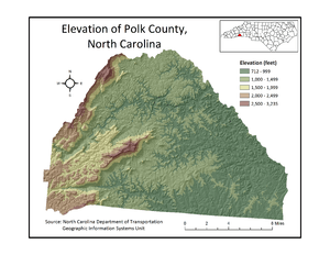 The elevation in the county ranges from just under 800 feet (240 m) near the confluence of the Green River and Broad River to over 3,200 feet (980 m) on Tryon Peak and Wildcat Spur, the highest peak in the county. Polk County is divided into two physiographic regions; the Blue Ridge Mountains in the western third of the county and Piedmont for the eastern two-thirds. Since it is in a transition zone between the two regions, Polk County is often referred to as being in the foothills.