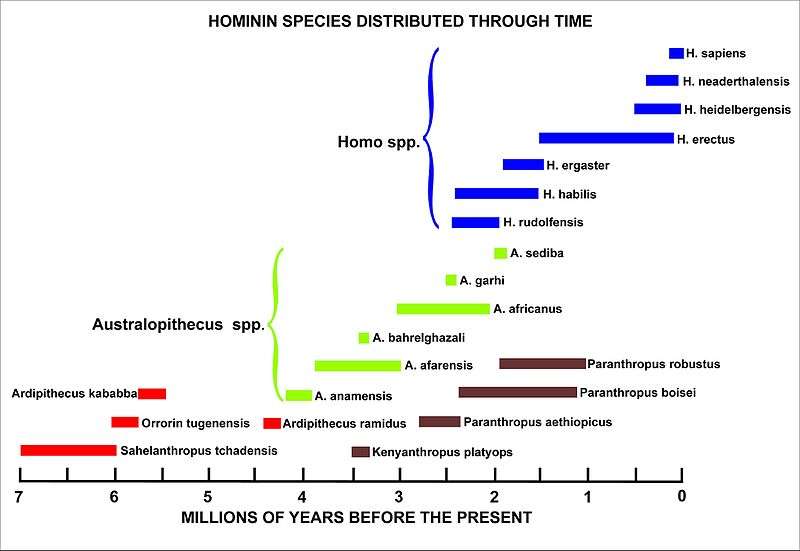 In apparent confirmation of this punctuated equilibrium view of evolution, the fossil record of an evolutionary progression typically consists of species that suddenly appear, and ultimately disappear, hundreds of thousands or millions of years later, without any change in external appearance.[71][84][86] Graphically, these fossil species are represented by horizontal lines, whose lengths depict how long each of them existed. The horizontality of the lines illustrates the unchanging appearance of each of the fossil species depicted on the graph. During each species' existence new species appear at random intervals, each also lasting many hundreds of thousands of years before disappearing without a change in appearance. The exact relatedness of these concurrent species is generally impossible to determine. This is illustrated in the following diagram depicting the evolution of modern humans from the time that the hominins separated from the line that led to the evolution of our closest living primate relatives, the chimpanzees.[86]