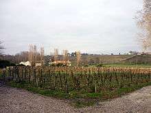 The Pomerol region, and its northern border, the Barbanne river was historically considered the frontier boundary between the north where people spoke the Langues d'oïl and the south where they spoke the Langue d'oc.[7] Though it is difficult to pinpoint exactly when grapes were first planted in the Pomerol region there is enough evidence to show that viticulture was present in the area during the time of the Romans.[8] Similarly there is uncertainty as to the origins of the name "Pomerol", although there is some speculation that it stems from the Latin word poma which refers to a fruit bearing seeds and is the origin of the French word pomme, meaning apple. This theory is supported by the region's long history of polyculture with many other crops, particularly fruits and grains, being cultivated in the area long before viticulture became a primary focus.[3]
