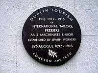 The International Tailors, Machinists and Pressers' Trade Union was founded in November 1908 (and registered in April 1909) by Jewish clothing workers hailing from the South Circular Road area. Its HQ was at 52 Camden Street (located next to the headquarters for Concern Worldwide). Aaron Klein of 14 Warren Street was its first treasurer. A later Secretary was Isaac Baker from Emorville Avenue.[26]