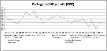 The Portuguese Economy has been steady, expanding continuously since the third quarter of 2014, with a yearly GDP growth of 1.5% registered in the second quarter of 2015.[27] The economy growth has been accompanied by a continuous fall in the unemployment rate (11.9% in the second quarter of 2015, compared with 13.9% registered in the end of 2014). The Government budget deficit has also been reduced from the 11.2% of GDP in 2010 to 4.8% in 2014. These rates mark an inversion from the negative trends caused by the impact of the Financial Crisis of 2008 in the Portuguese Economy, that made it to shrink for three consecutives years (2011, 2012 and 2013), accompanied by a high increase of the unemployment rate (that achieved a record of 17.7% in the early 2013).[28] The crisis has caused a wide range of domestic problems that are specifically related to the levels of public deficit, as well as the excessive debt levels, in the economy, culminating in the confirmation from Portugal to a €78 billion financial bailout from the EU in April 2011, following similar decisions from Greece and Ireland. The government that assumed office in June 2011 had to face tough choices in regard to its attempts to stimulate the economy while at the same time seeking to maintain its public deficit around the EU average.[29]