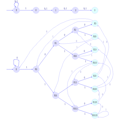 Because the DFA states consist of sets of NFA states, an n-state NFA may be converted to a DFA with at most 2n states.[2] For every n, there exist n-state NFAs such that every subset of states is reachable from the initial subset, so that the converted DFA has exactly 2n states, giving Θ(2n) worst-case time complexity.[8] A simple example requiring nearly this many states is the language of strings over the alphabet {0,1} in which there are at least n characters, the nth from last of which is 1. It can be represented by an (n + 1)-state NFA, but it requires 2n DFA states, one for each n-character suffix of the input; cf. picture for n=4.[4]