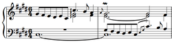The subject (C-sharp, B-sharp, E, D-sharp C-sharp) is a cross motif in half and whole notes. But for one interval, it is the same as BACH's signature motif. The contour of descending half step, ascending diminished fourth, and descending half step is the same as the Advent Chorale "Nun Komm, der Heiden Heiland" (Kerman 2005, 28). (The second theme, which enters in measure 36, is a flowing changing-tone motif, in eighth notes, that can be heard as a diminution and motivic transformation of the main subject. In measure 49 a third theme enters in concert with the prior two. These three are heard as invertible counterpoint in measures 49-88, at which point the second theme drops away. Thereafter, the 1st and 3rd themes continue to the end, with a striking dissonance on the downbeat of measure 112, four bars before the end.