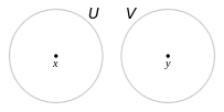 Points x and y in a topological space X can be separated by neighbourhoods if there exists a neighbourhood U of x and a neighbourhood V of y such that U and V are disjoint (U ∩ V = ∅). X is a Hausdorff space if all distinct points in X are pairwise neighborhood-separable. This condition is the third separation axiom (after T0 and T1), which is why Hausdorff spaces are also called T2 spaces. The name separated space is also used.