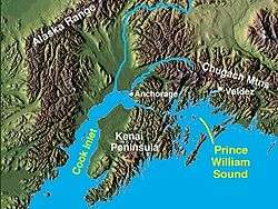 Prince William Sound is a sound of the Gulf of Alaska on the south coast of the U.S. state of Alaska. It is located on the east side of the Kenai Peninsula. Its largest port is Valdez, at the southern terminus of the Trans-Alaska Pipeline System. Other settlements on the sound, which contains numerous small islands, include Cordova and Whittier plus the Alaska native villages of Chenega and Tatitlek.