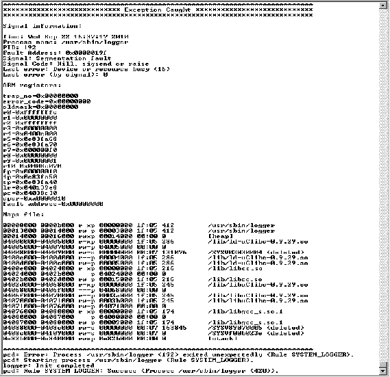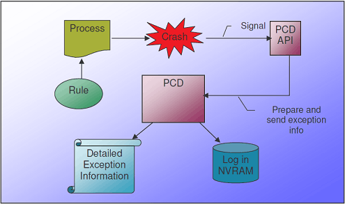 The PCD also provides a lot of useful debug information that can help the developers and the test engineers to understand what happened. The debug information is displayed on the system's console, and can be stored in a non-volatile storage for later analysis. The detailed debug information includes all the process details, all signal details, a complete register dump (on supported architectures) and the process's address map.
