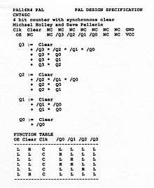 Programmable Array Logic (PAL) is a family of programmable logic device semiconductors used to implement logic functions in digital circuits introduced by Monolithic Memories, Inc. (MMI) in March 1978.[1] MMI obtained a registered trademark on the term PAL for use in "Programmable Semiconductor Logic Circuits". The trademark is currently held by Lattice Semiconductor.[2]