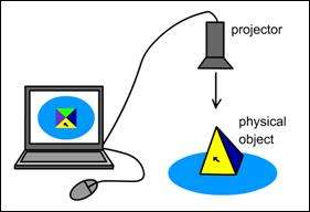 A projection augmented model (PA model) consists of a physical three-dimensional model, onto which a computer image is projected to create a realistic looking object (Figure 2). Importantly, the physical model is the same geometric shape as the object that the PA model depicts. For example, the image projected onto the objects shown in Figure 3 provides colour and visual texture, which makes them appear to be made from different materials.