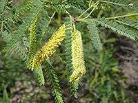 The mesquite is deciduous, losing its leaves in winter, and leafs out again in the spring when all danger of frost is past. Because of its deep root system, it keeps its leaves in the dry months of summer in all but the most severe drought years. The flowers are yellow and form in the spring (after the leaves) in dense cylindrical clusters (catkins) roughly 4 in (10 cm) long. Long seedpods (legumes) form from the flowers. They are bright green and look somewhat like pea pods when young. Mature, dry pods are hard and contain several hard, dry, brown seeds. The seeds need to be scarified before they can germinate. This scarification typically takes place in the digestive tracts of animals, which eat the seeds and then disperse them widely, as the seed takes days to pass through the animal.[3]