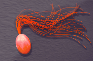 The species was taken from the thermal marine sediments and studied by growing it in culture in a lab. Pyrococcus furiosus is noted for its rapid doubling time of 37 minutes under optimal conditions, meaning that every 37 minutes, the number of individual organisms is multiplied by 2, yielding an exponential growth curve. It appears as mostly regular cocci—meaning that it is roughly spherical—of 0.8 µm to 1.5 µm diameter with monopolar polytrichous flagellation. Each organism is surrounded by a cellular envelope composed of glycoprotein, distinguishing them from bacteria.