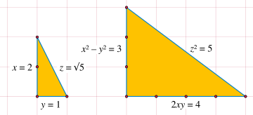 By using the Pythagorean theorem, this representation can be interpreted geometrically: the Pythagorean primes are exactly the odd prime numbers p such that there exists a right triangle, with integer legs, whose hypotenuse has length √p. They are also exactly the prime numbers p such that there exists a right triangle with integer sides whose hypotenuse has length p. For, if the triangle with legs x and y has hypotenuse length √p (with x > y), then the triangle with legs x2 − y2 and 2xy has hypotenuse length p.[5]