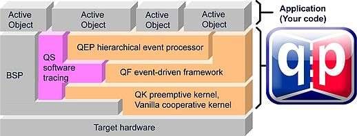 QP consists of a universal UML-compliant event processor (QEP), a portable, event-driven, real-time framework (QF), a tiny run-to-completion kernel (QK), and software tracing system (QS).