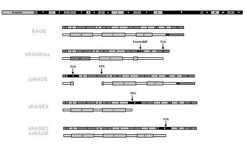 The primary transcript of the human RAGE gene (pre-mRNA) is thought to be alternatively spliced. So far about 6 isoforms including the full length transmembrane receptor have been found in different tissues such as lung, kidney, brain etc. Five of these 6 isoforms lack the transmembrane domain and are thus believed to be secreted from cells. Generally these isoforms are referred to as sRAGE (soluble RAGE) or esRAGE (endogenous secretory RAGE). One of the isoforms lacks the V-domain and is thus believed not to be able to bind RAGE ligands.
