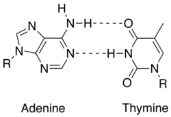 In molecular biology, two nucleotides on opposite complementary DNA or RNA strands that are connected via hydrogen bonds are called a base pair (often abbreviated bp). In the canonical Watson-Crick base pairing, adenine (A) forms a base pair with thymine (T) and guanine (G) forms one with cytosine (C) in DNA. In RNA, thymine is replaced by uracil (U). Alternate hydrogen bonding patterns, such as the wobble base pair and Hoogsteen base pair, also occur—particularly in RNA—giving rise to complex and functional tertiary structures. Importantly, pairing is the mechanism by which codons on messenger RNA molecules are recognized by anticodons on transfer RNA during protein translation. Some DNA- or RNA-binding enzymes can recognize specific base pairing patterns that identify particular regulatory regions of genes. Hydrogen bonding is the chemical mechanism that underlies the base-pairing rules described above. Appropriate geometrical correspondence of hydrogen bond donors and acceptors allows only the "right" pairs to form stably. DNA with high GC-content is more stable than DNA with low GC-content, but contrary to popular belief, the hydrogen bonds do not stabilize the DNA significantly and stabilization is mainly due to stacking interactions.[2]