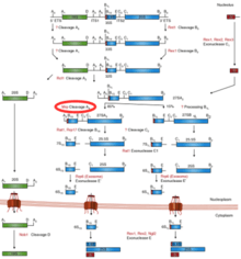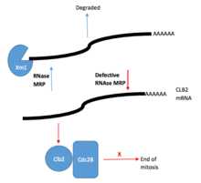 RNAase MRP and its role in pre-rRNA processing has been previously studied in Yeast cells. RNase MRP has been shown to cleave an internal transcribed spacer, specifically ITS1 at the specific site A3 of the rRNA precursor, leading, after additional trimming, to the formation of the mature 5′-end of 5.8S rRNA. Recent data that has been gathered using several temperature-sensitive RNase MRP mutants that showed that inactivation of RNase MRP leading to severe reduction of the abundance of all early intermediates in the typical rRNA processing pathway. However, the transcription of the rRNA precursor is not affected, thus suggesting that RNase MRP plays a key role in the processing of rRNA beyond the cleavage of the A3 site in ITS1. Further research in Yeast cell RNase MRP has shown a potential role in the regulation of the cell cycle. RNase MRP mutations led to missegregation of plasmids and caused cell cycle delay at the end of mitosis, followed by a buildup of cyclin B2 (CLB2) protein (resulting from increased CLB2 mRNA concentration that codes for the CLB2 protein). RNase MRP also demonstrated cleavage ability of the 5′-UTR of CLB2 mRNA that allows for rapid 5′-to-3′ degradation by XRN1, an exoribonuclease enzyme.[4]