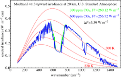 where C is the CO2 concentration in parts per million by volume and C0 is the reference concentration.[6] The relationship between carbon dioxide and radiative forcing is logarithmic[7] and thus increased concentrations have a progressively smaller warming effect.