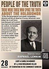 | “ | An inspiring address was delivered at the rally by Prof. Raphael Lemkin, author of the United Nations Convention against Genocide, that is, deliberate mass murder of peoples by their oppressors. Prof. Lemkin reviewed in a moving fashion the fate of the millions of Ukrainians before and after 1932–33, who died victims to the Soviet Russian plan to exterminate as many of them as possible in order to break the heroic Ukrainian national resistance to Soviet Russian rule and occupation and to Communism. | ” |