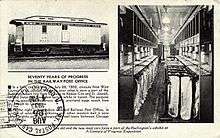 The Railway post office was introduced in the United States on July 28, 1862, using converted baggage cars on the Hannibal and St. Joseph Railroad (which also delivered the first letter to the Pony Express). Purpose-built Railway Post Office (RPO) cars entered service on this line a few weeks after the service was initiated. Their purpose was to separate mail for connection with a westbound stagecoach departing soon after the train's arrival at St. Joseph. This service lasted approximately one year.[4] The first permanent Railway Post Office route was established on August 28, 1864, between Chicago, Illinois, and Clinton, Iowa.[5] This service is distinguished from the 1862 operation because mail was sorted to and received from each post office along the route, as well as major post offices beyond the route's end-points.