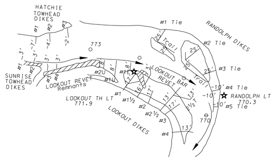 | ––––––– = Dike positions | 00' = Dike elevation in feet | #00 = Tie number |