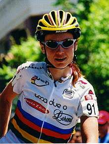 ![]() Rasa Polikevičiūtė during the introductions prior to one of the stages of the 2002 Women's Challenge stage race. She is wearing the Rainbow Jersey which signifies that she was the (then) current World Road Race Champion. | ||||||||||||||||||||||