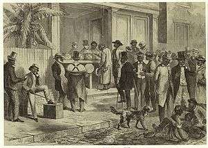 The ruins of Richmond, Virginia after the American Civil War, newly freed African Americans voting for the first time in 1867,[1] Office of the Freedmen's Bureau in Memphis, Tennessee, Memphis Riots of 1866 | |