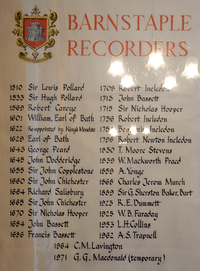- 1758-1796: Benjamin Incledon (1730-1796) (pronounced "Ingledon") of Pilton House, Pilton, near Barnstaple, an antiquarian and genealogist. He served as Recorder of Barnstaple from 1758 to 1796.[11]