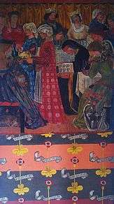 Morris added to both the House's interior and the design of the garden intermittently over the years, aided by his various friends.[56] There was to be no wallpaper anywhere in the House, with the walls instead being painted or covered by tapestries.[57] The walls of the staircase were intended to feature a painted mural by Burne-Jones depicting scenes from the Trojan War, while on the wall of the hall beneath was intended to be a picture of warships carrying the ancient Greek soldiers to Troy. Although depicting scenes from ancient Classical mythology, Morris had wanted the designs to be Medieval in style, with the warships being based on those of the fourteenth century.[56] On the hallway cupboard, Morris began (although never finished) a painting based on Thomas Malory's tale of how Sir Lancelot brought Sir Tristram and La Belle Iseult to the castle of the Joyous Garde. The figures themselves are depictions of some of Morris' friends, among them Jane, Faulkner, the Burne-Joneses, and Lizzie Siddel.[58] In the dining-room, Morris planned to decorate the walls with a series of embroidered female heroines, based in Geoffrey Chaucer's The Legend of Good Women. Produced by Jane and her sister Bessie, only seven or eight were completed.[59]