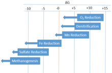 The degradation of organic matter through respiration in the modern ocean is facilitated by different electron acceptors, their favorability based on Gibbs free energy law, and the laws of thermodynamics. This redox chemistry is the basis for life in deep sea sediments and determines the obtainability of energy to organisms that live there. From the water interface moving toward deeper sediments, the order of these acceptors is oxygen, nitrate, manganese, iron, and sulfate. The zonation of these favored acceptors can be seen in Figure 1. Moving downwards from the surface through the zonation of these deep ocean sediments, acceptors are used and depleted. Once depleted the next acceptor of lower favorability takes its place. Thermodynamically, oxygen represents the most favorable electron accepted but is quickly used up in the water sediment interface and O2 concentrations extends only millimeters to centimeters down into the sediment in most locations of the deep sea. This favorability indicates an organism's ability to obtain higher energy from the reaction which helps them complete with other organisms.[3] In the absence of these acceptors, organic matter can also be degraded through methanogenesis, but the net oxidation of this organic matter is not fully represented by this process. Each pathway and the stoichiometry of its reaction are listed in table 1.[3]