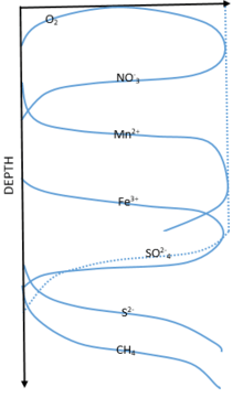 Redox zonation refers to how the processes that transfer terminal electrons as a result of organic matter degradation vary depending on time and space.[6] Certain reactions will be favored over others due to their energy yield as detailed in the energy acceptor cascade detailed above.[7] In oxic conditions, in which oxygen is readily available, aerobic respiration will be favored due to its high energy yield. Once the use of oxygen through respiration exceeds the input of oxygen due to bioturbation and diffusion, the environment will become anoxic and organic matter will be broken down via other means, such as denitrification and manganese reduction.[8]